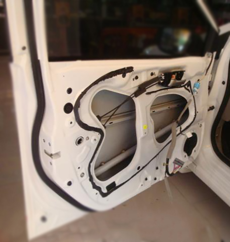 本隔声结构采用双层隔声的方法。第一层隔音材料为高能隔音材料。第一层的主要目的是加强门板的刚度和停止振动。第二层是保证门的密闭性,减少风噪声的侵入。